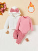 3-Piece Newborn Baby Girl Fall/Winter Warm Soft Fuzzy Bow Hooded Sweatshirt And Long Pants Knitted Jumpsuit Set Baby Pink