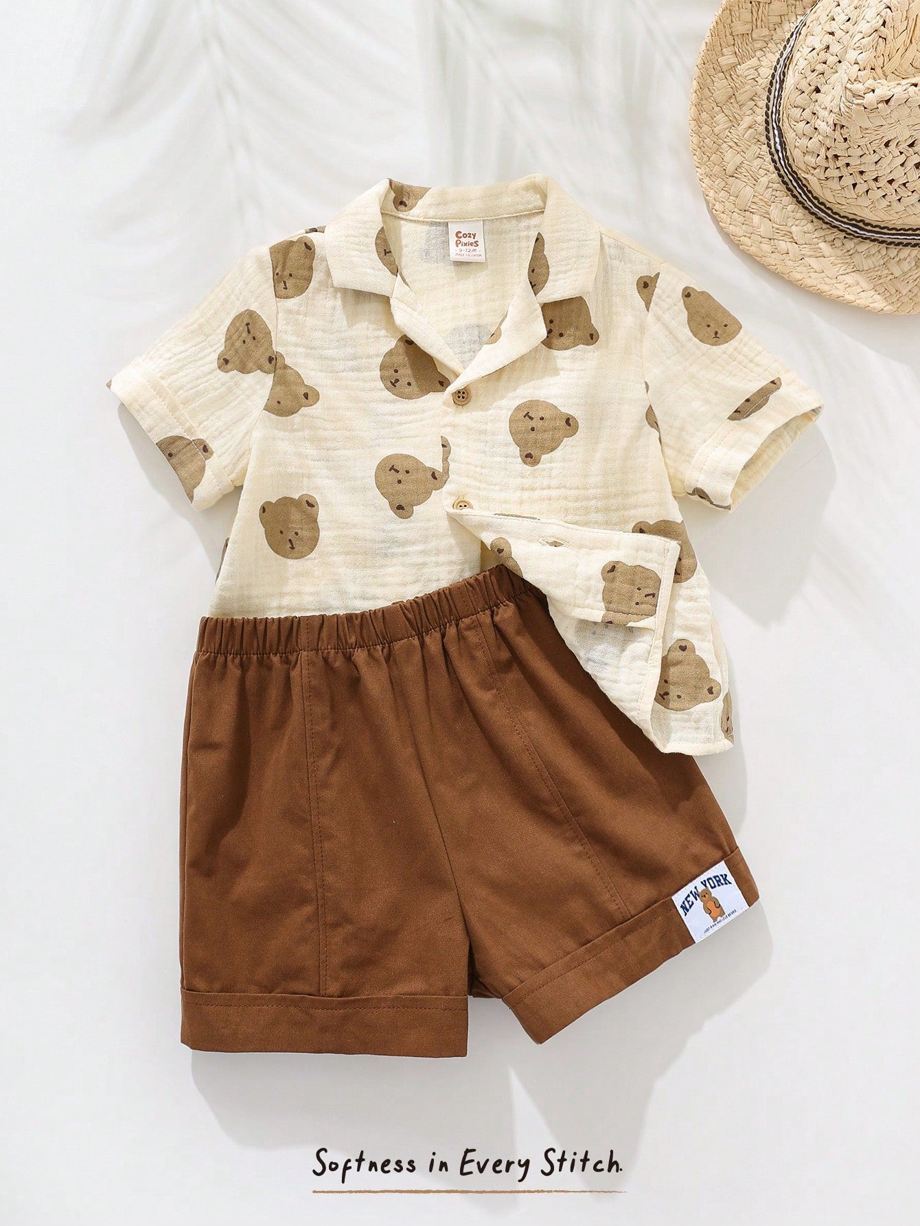 Baby Boy Cartoon Bear Graphic Lapel Collar Short Sleeve Cardigan Top And Elastic Waist Shorts Set