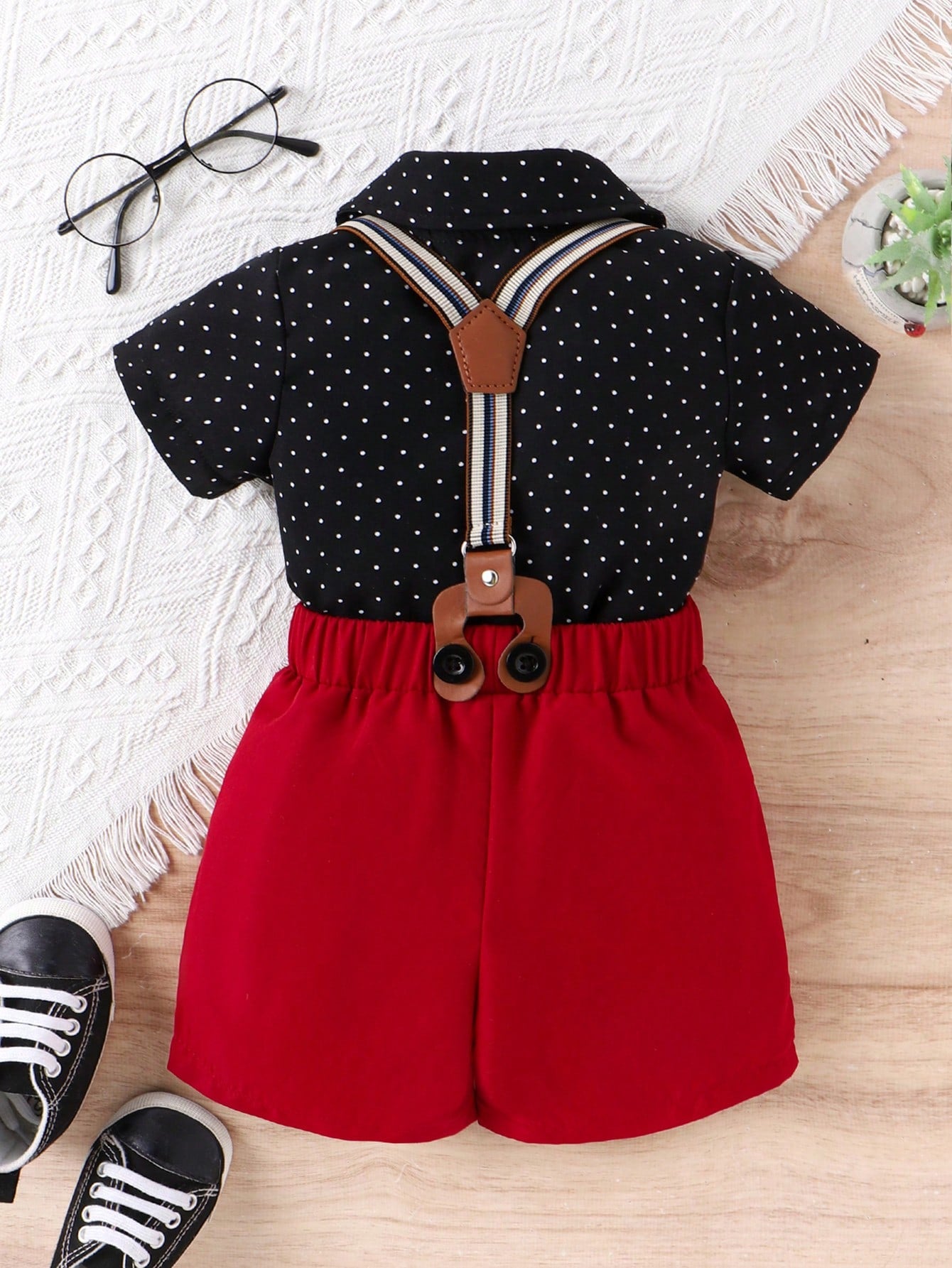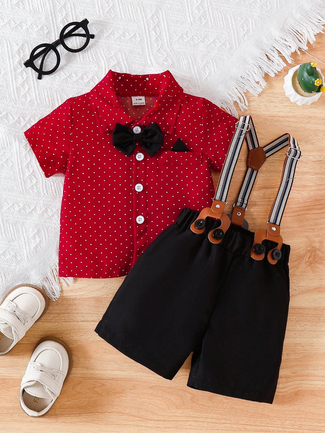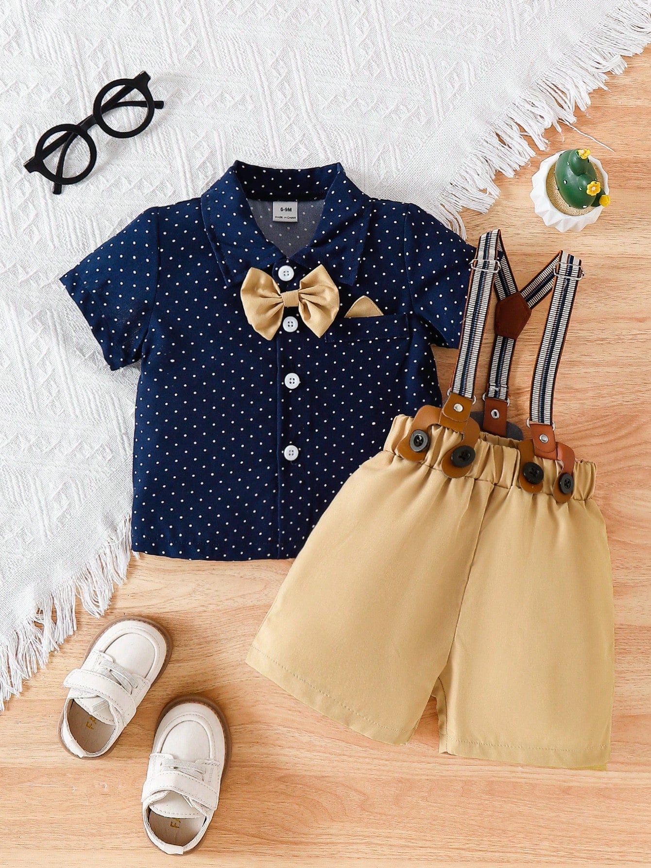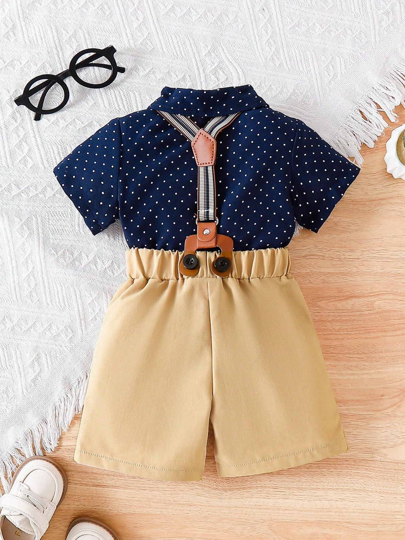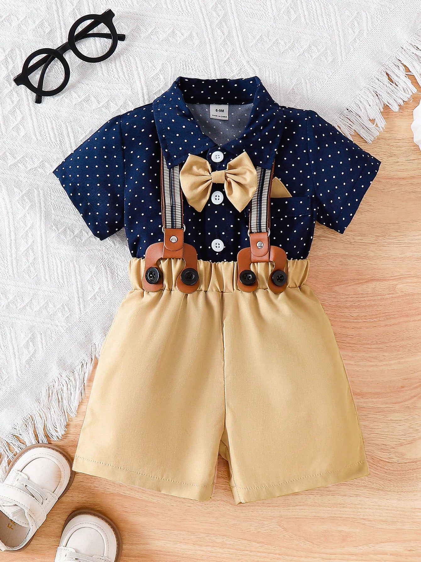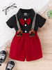 Baby Boy Polka Dot Collar Single-Breasted Short Sleeve Top And Bib Shorts