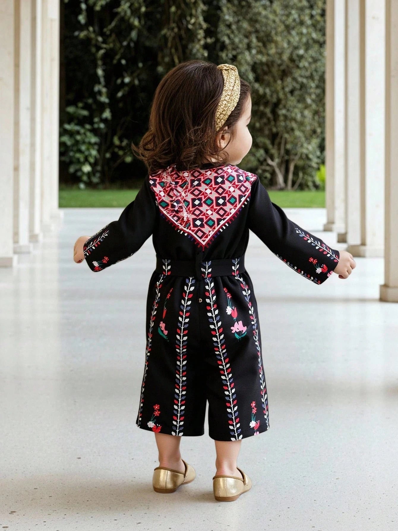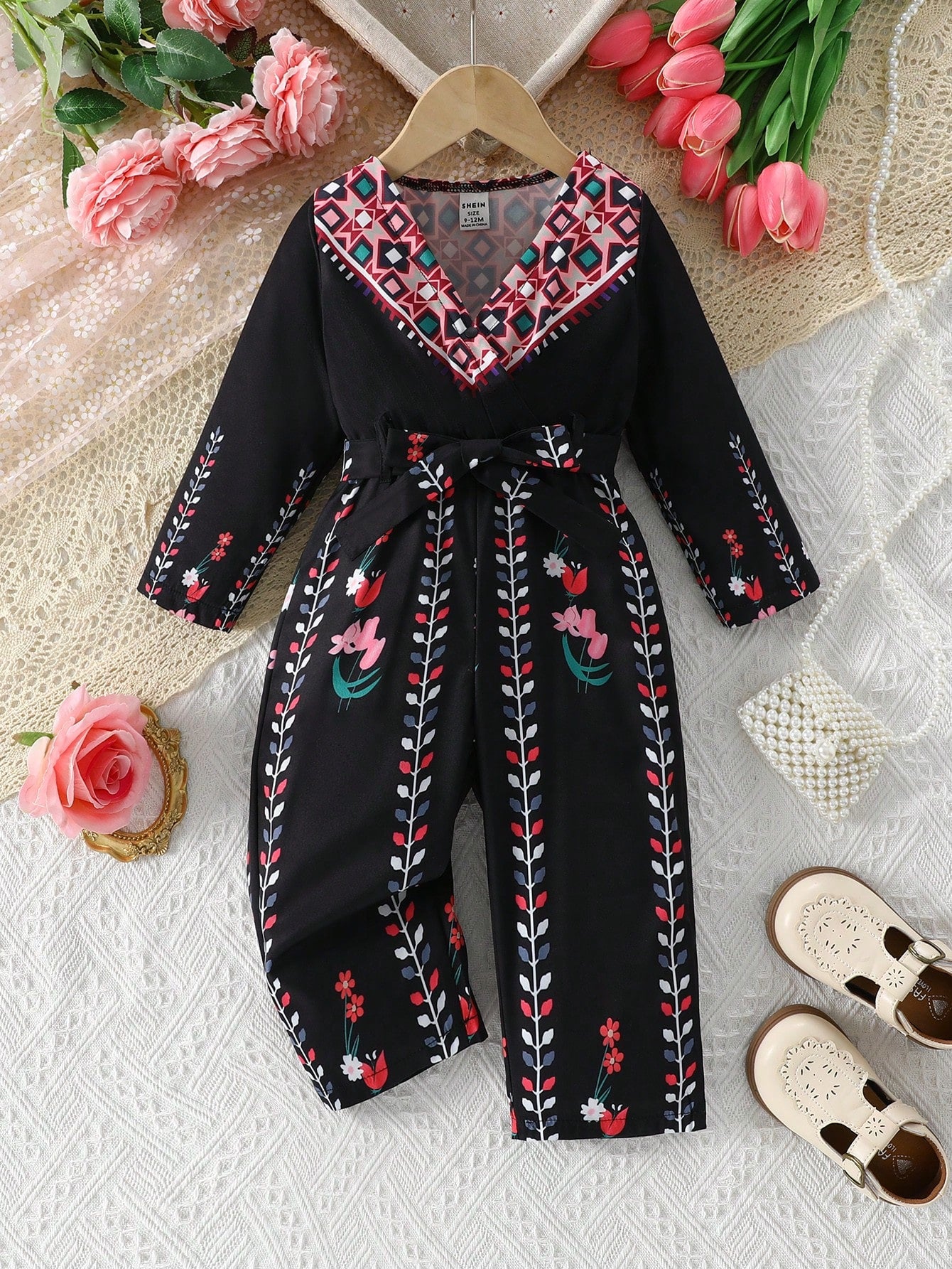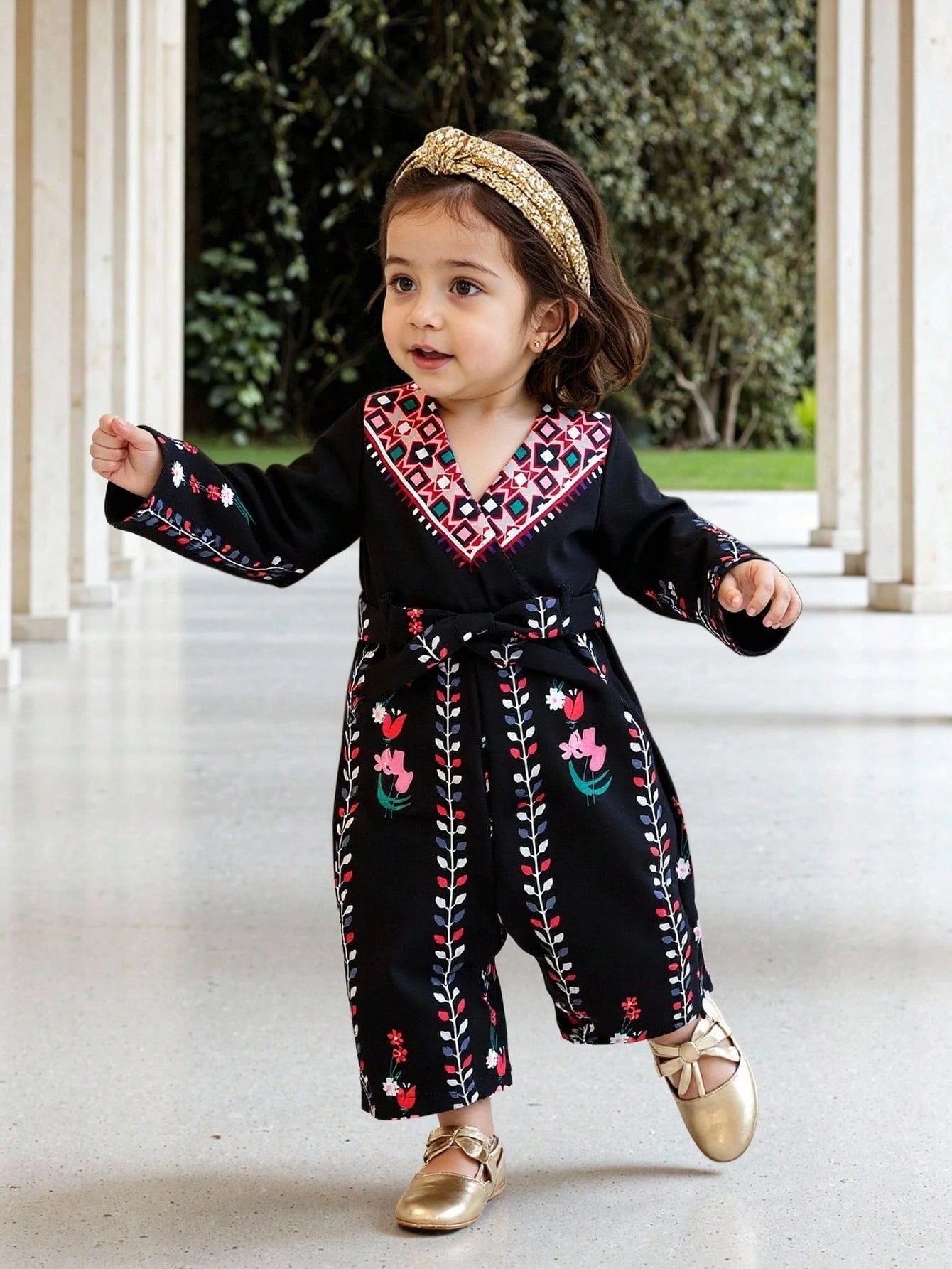 Baby Girl Floral Print Front Opening Short Sleeve Jumpsuit With Belt