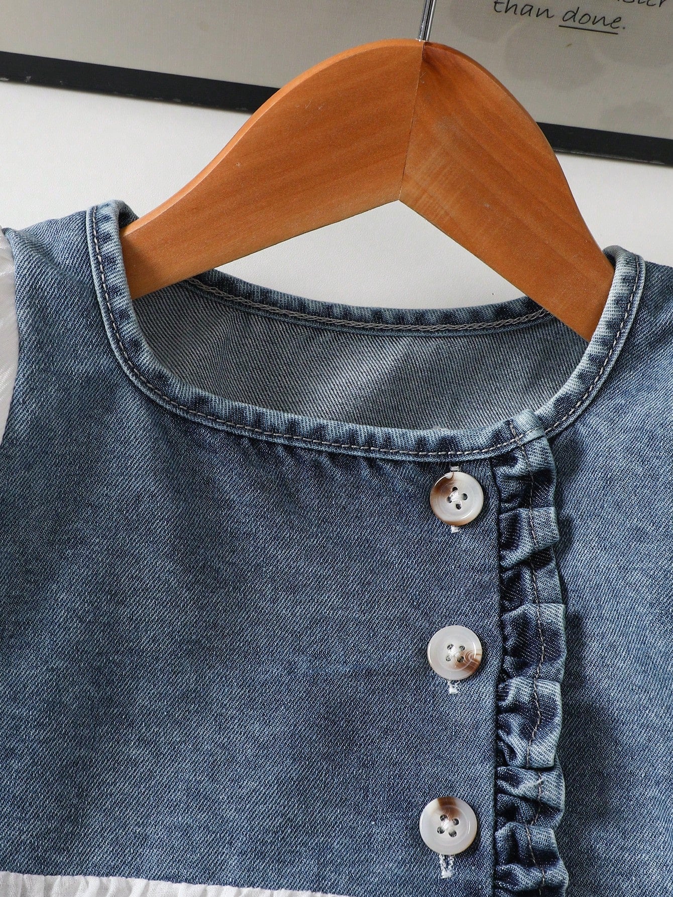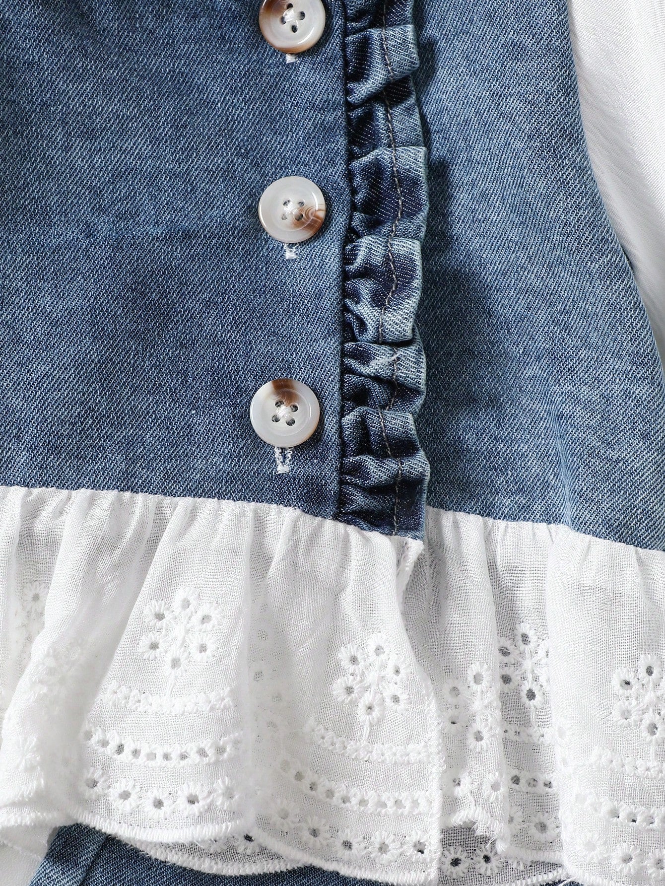 Baby Girls Casual Denim Patchwork Round Neck Shirt & Jeans Pants Set