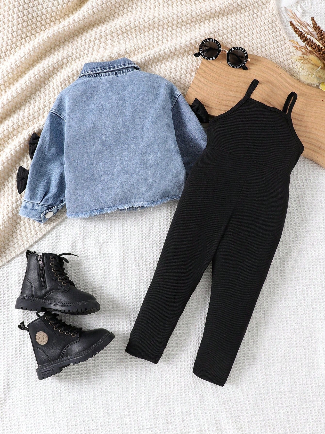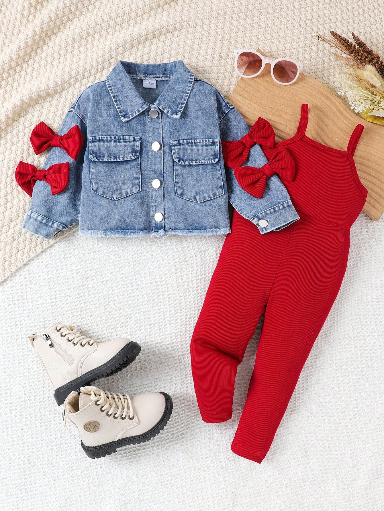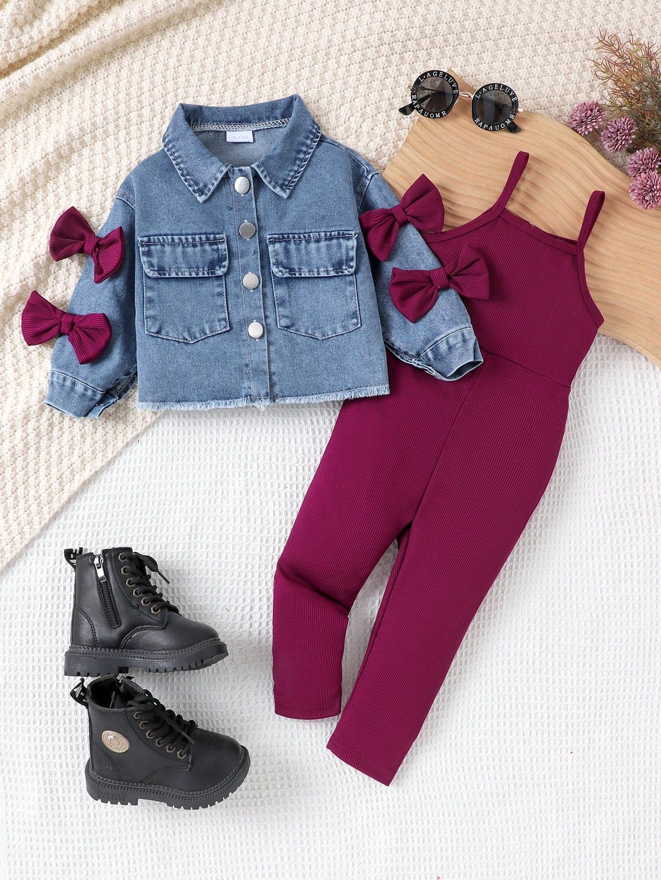 Baby Girls Vintage Street Style Bow Pocket Denim Long Sleeve Jacket And Bib Pants Set