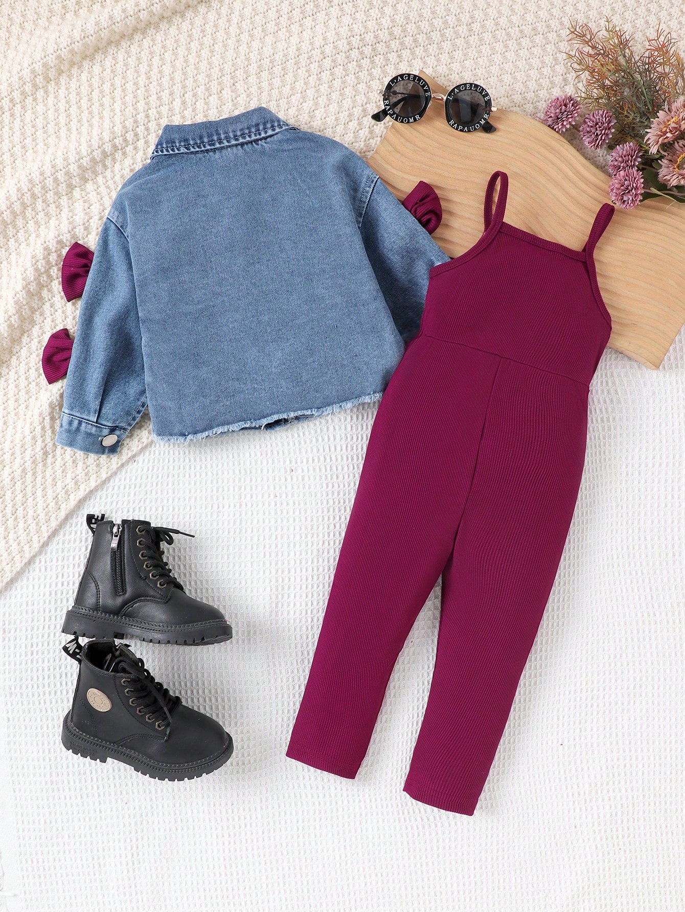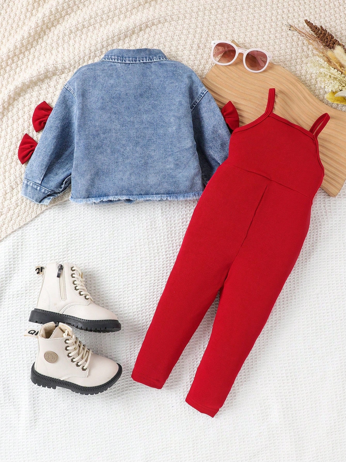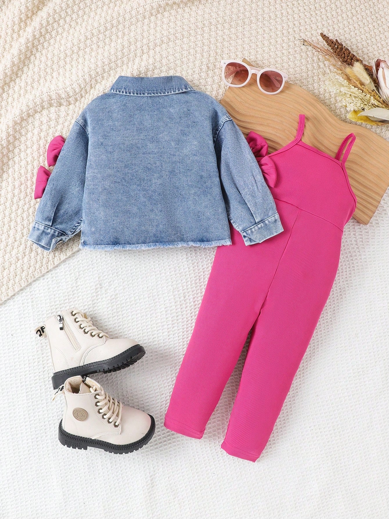 Baby Girls Vintage Street Style Bow Pocket Denim Long Sleeve Jacket And Bib Pants Set