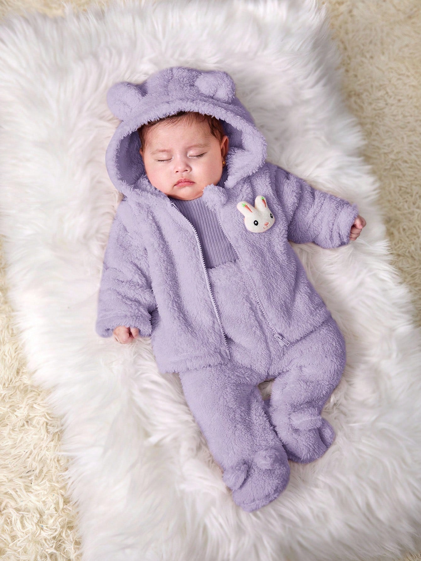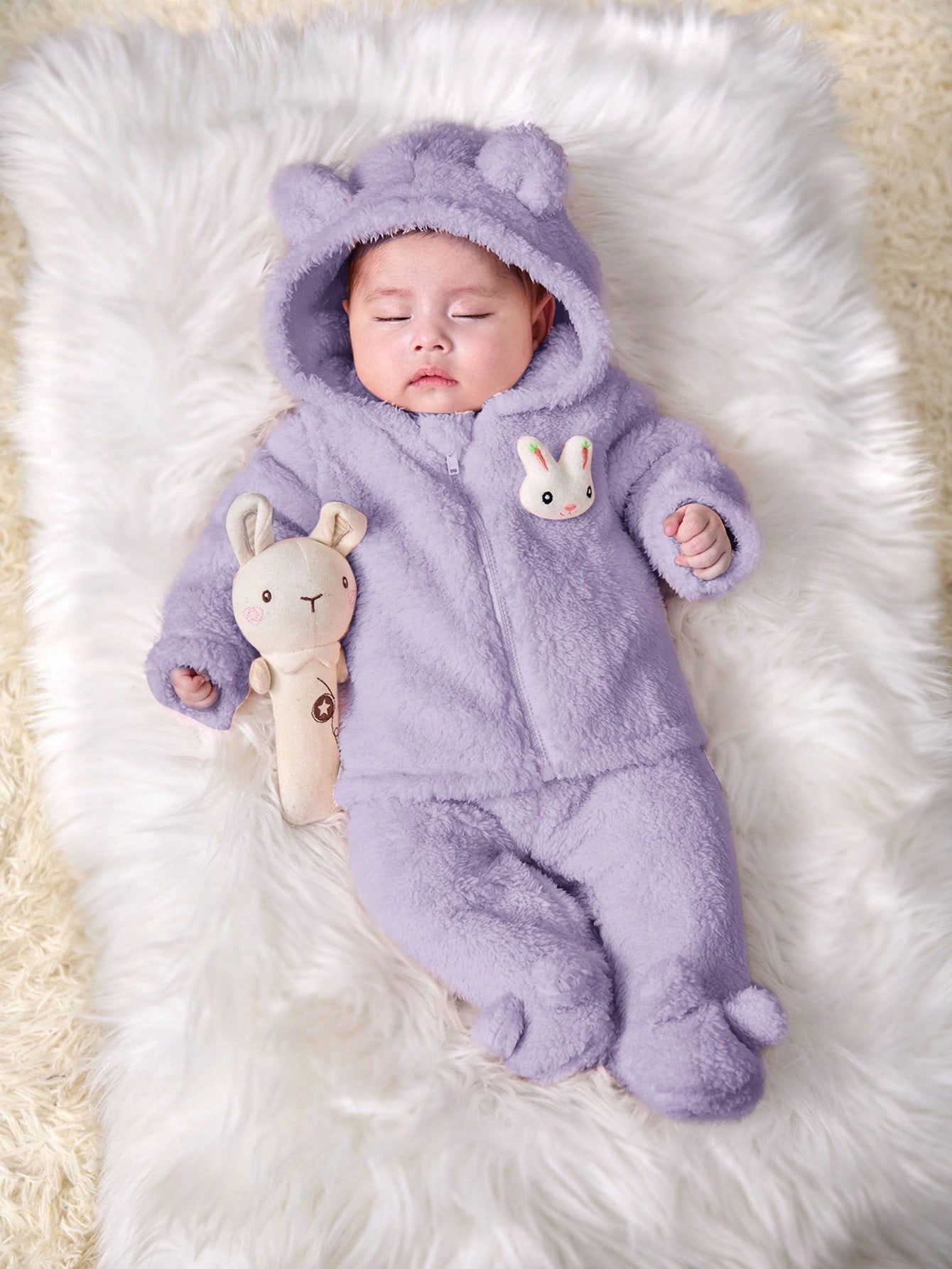 Newborn Baby Girl Cute Pink Fluffy Cartoon Pattern Hooded Jacket And Elastic Waist Pants Set