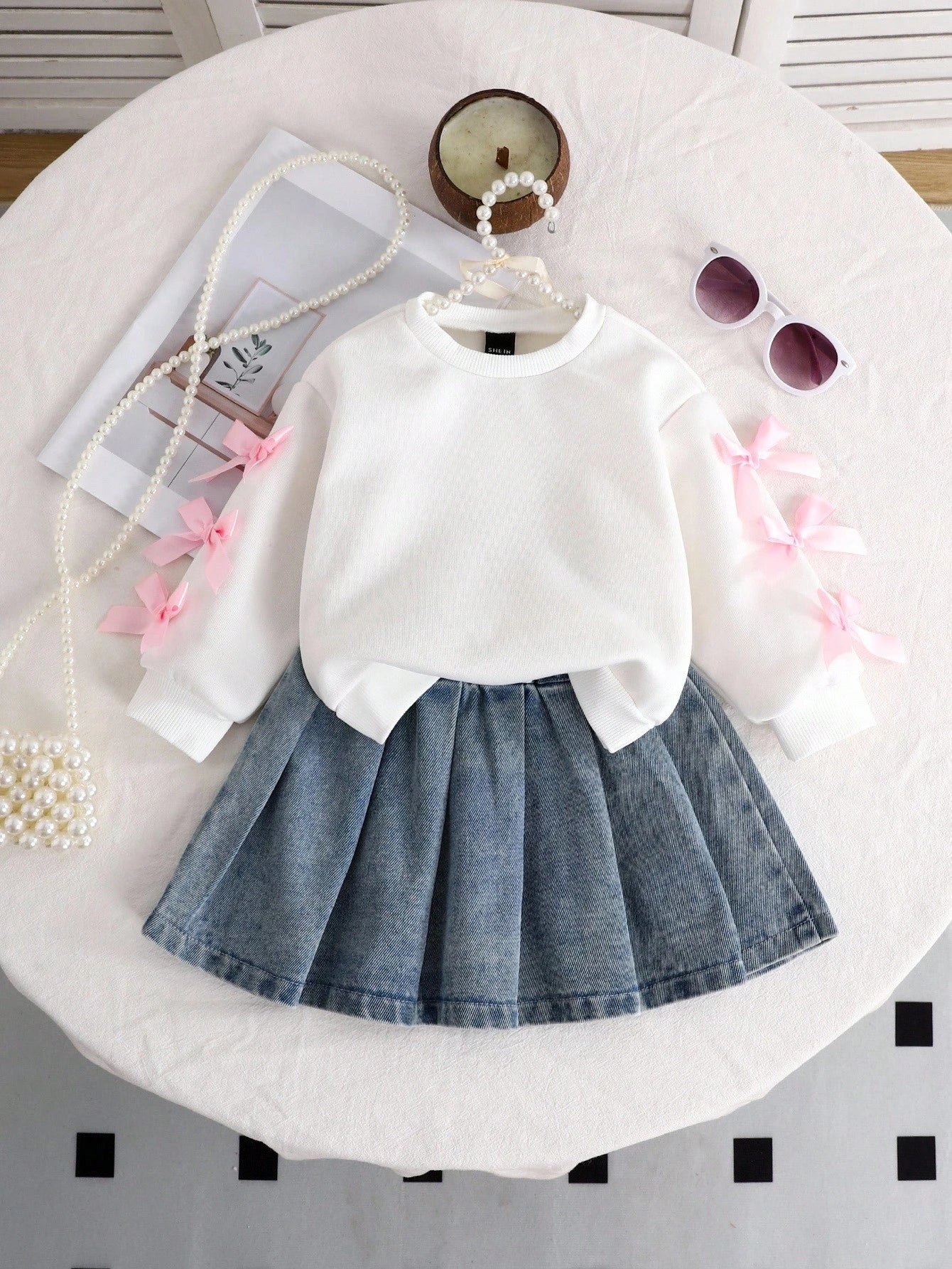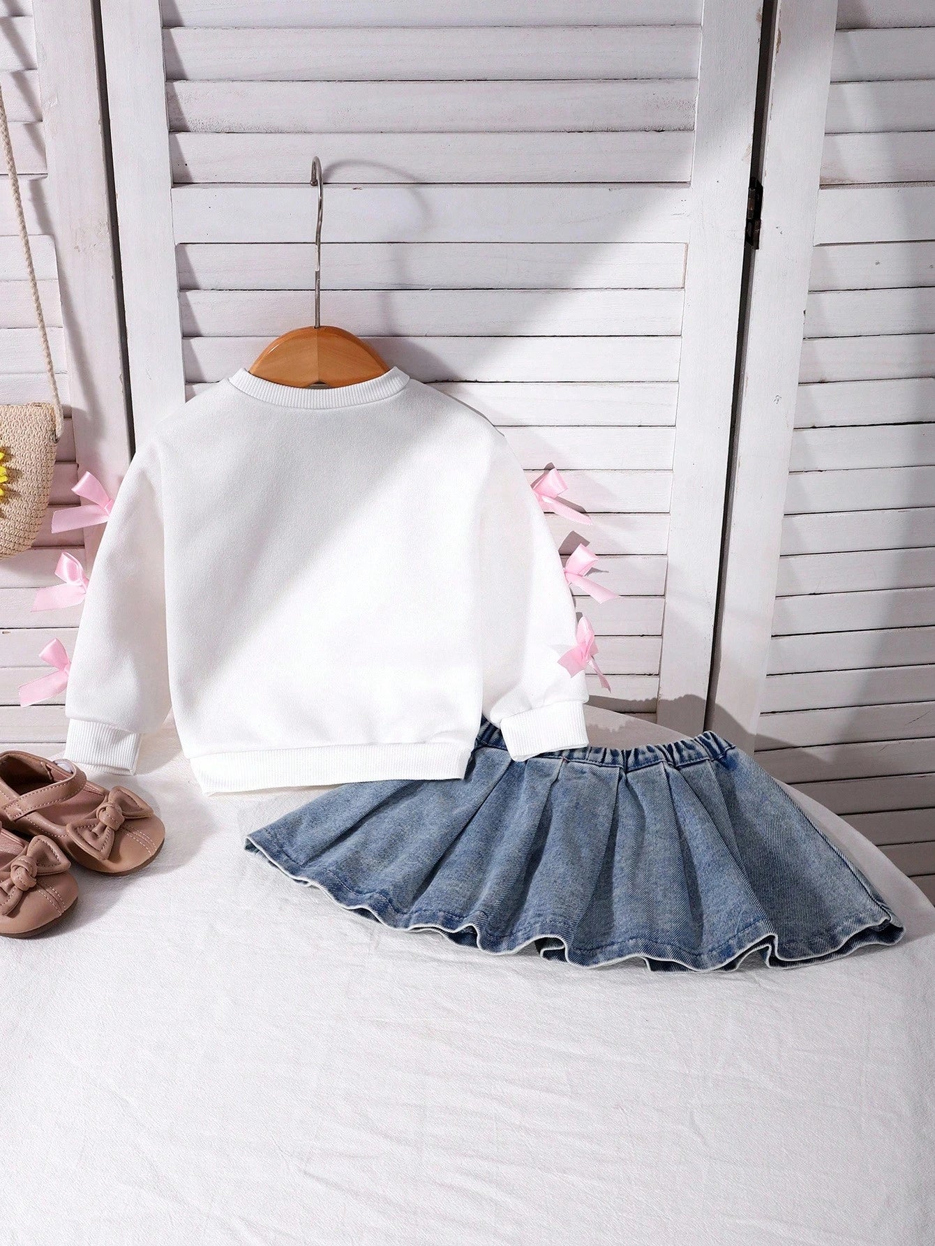 SHEIN Playful Pals Baby Girls' White Bow Sweatshirt & Blue Denim Pleated Skirt Set