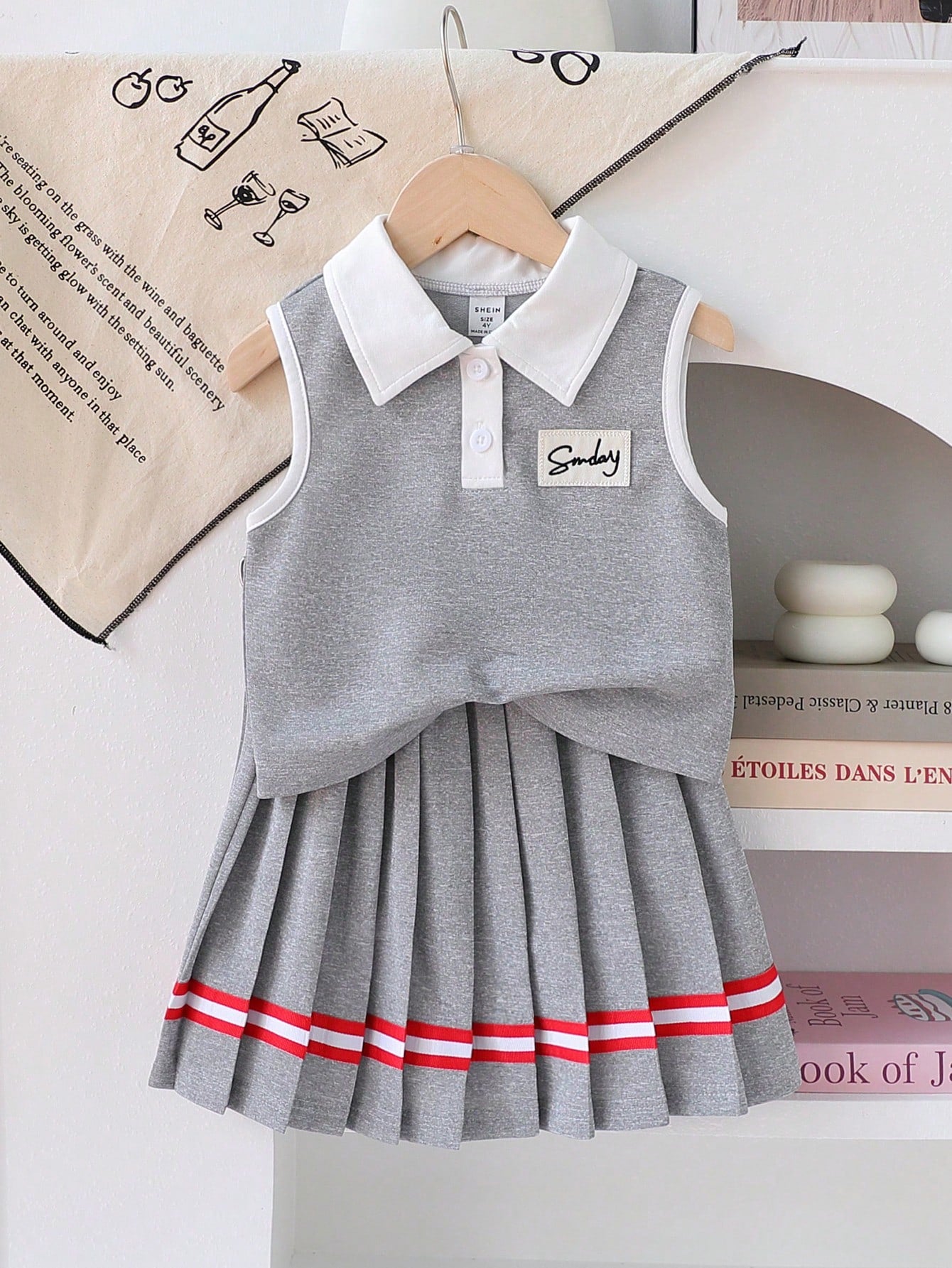 Style Polo Collar Sleeveless Knit T-Shirt Top And Pleated Skirt Set