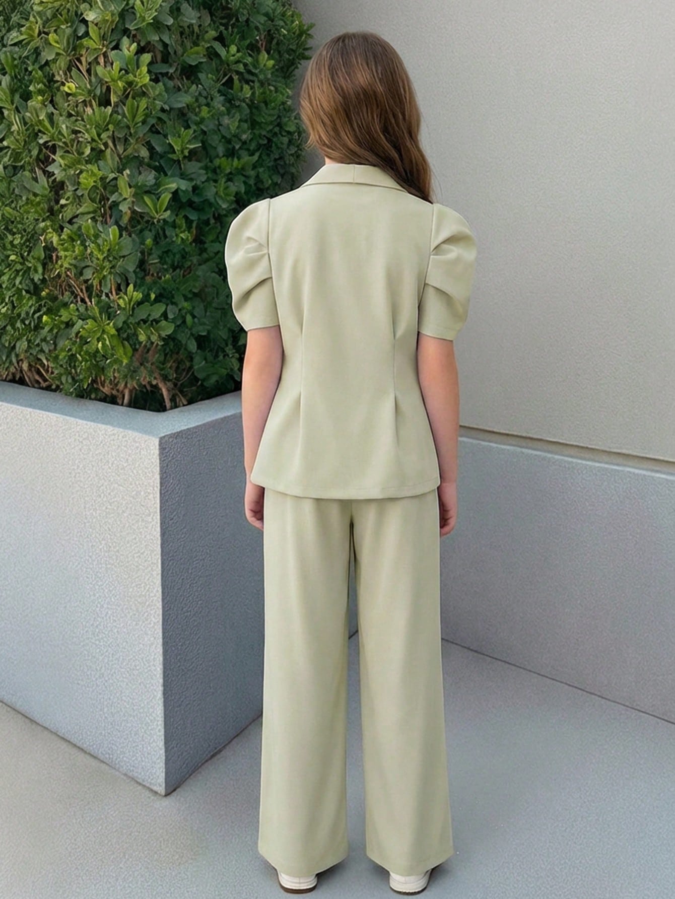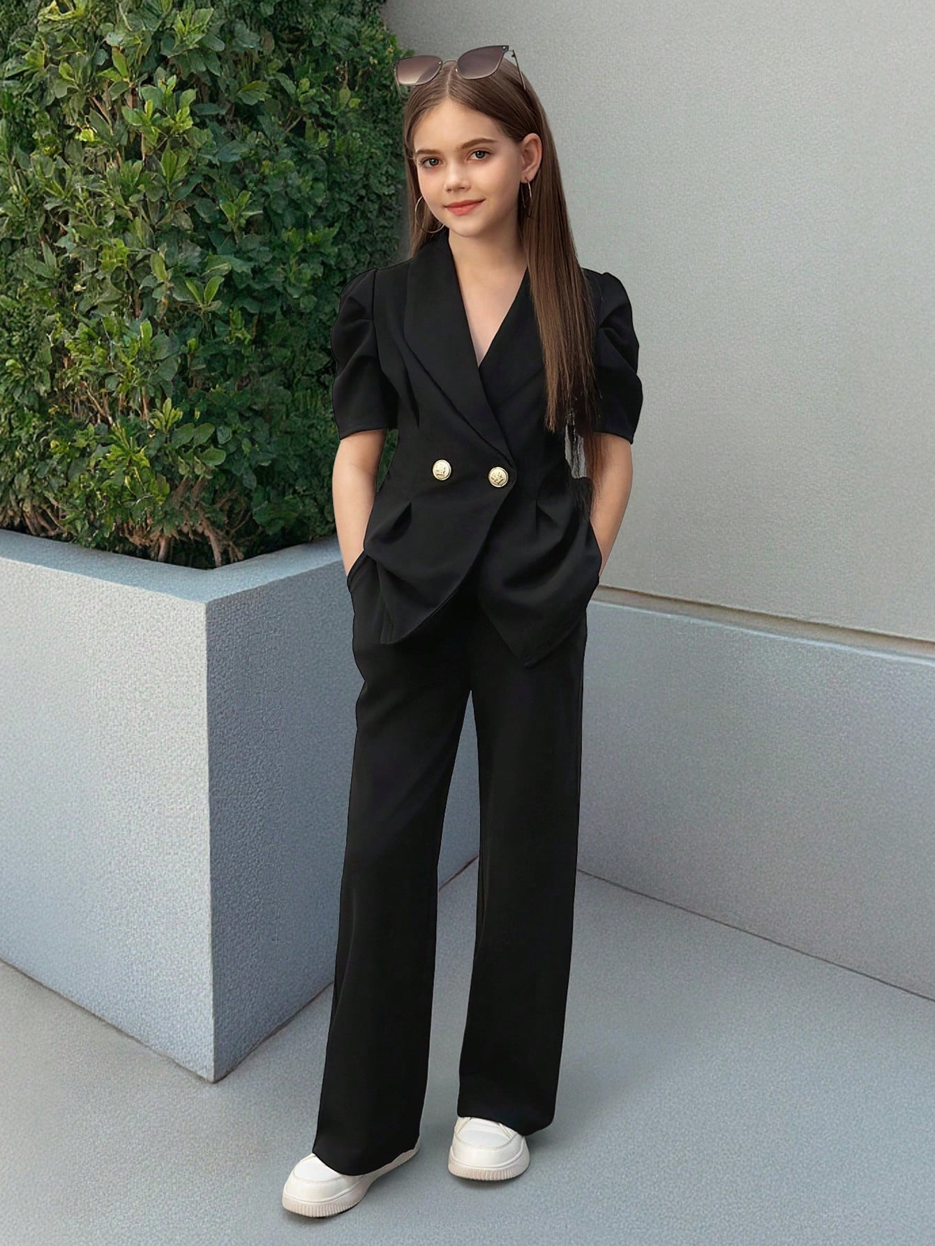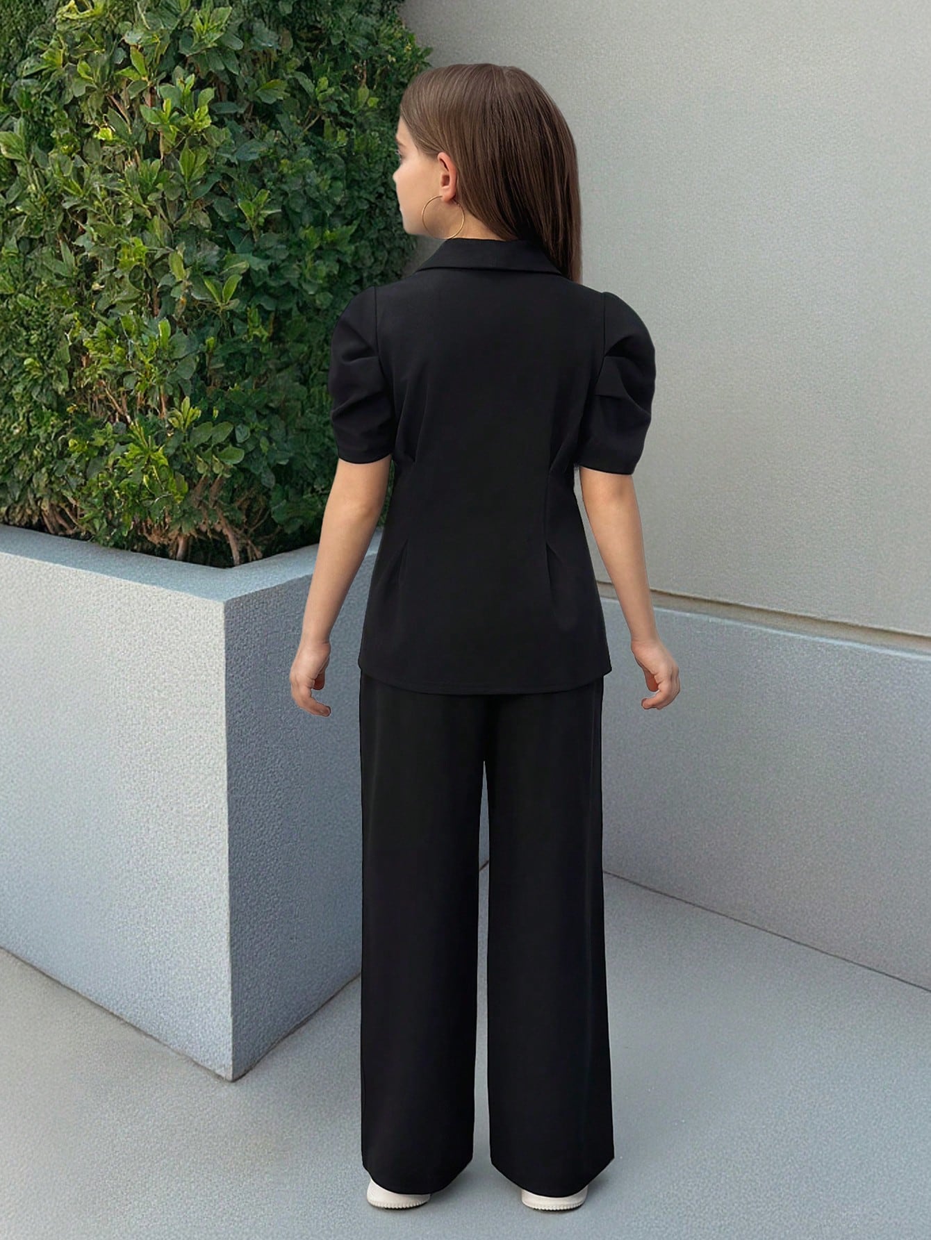 Tween Girl 2 Pieces Set Black Vintage Flared Sleeve Fitted Blazer & Straight Leg Pants