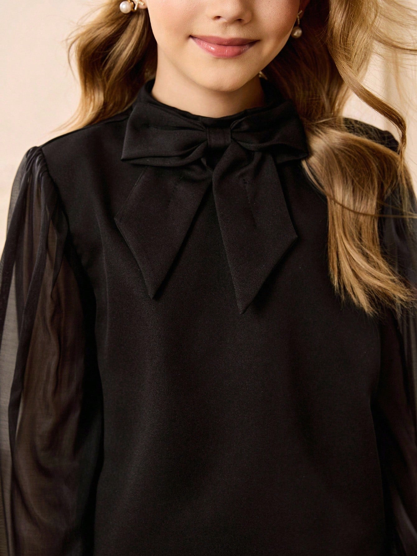 Tween Girls Elegant Cute Black Long Sleeve Top With Bow, Soft Tulle Lantern Sleeve, White Flared Pants