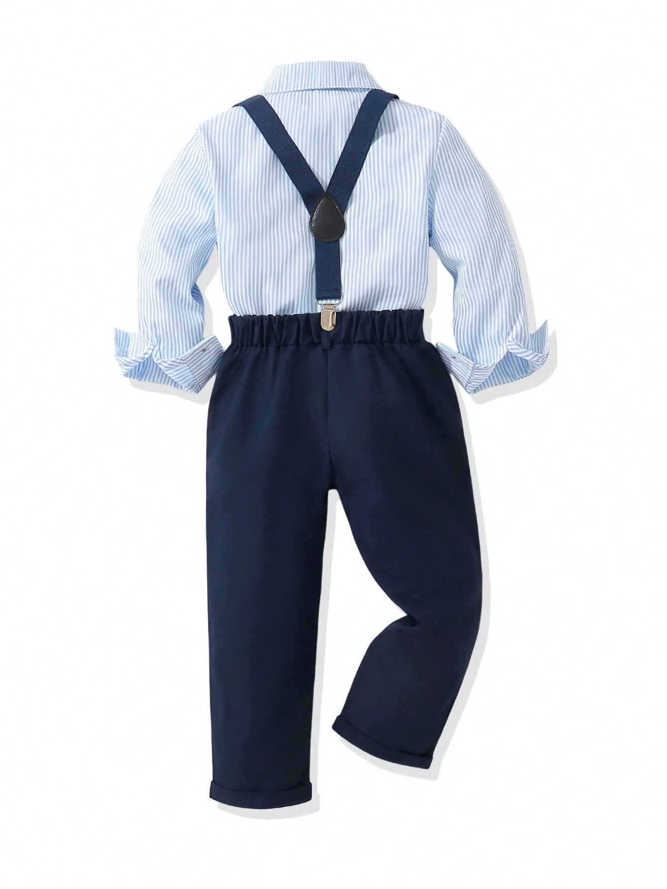 Young Boy Striped Long Sleeve Shirt With Suspender Pants Gentleman Outfit Set